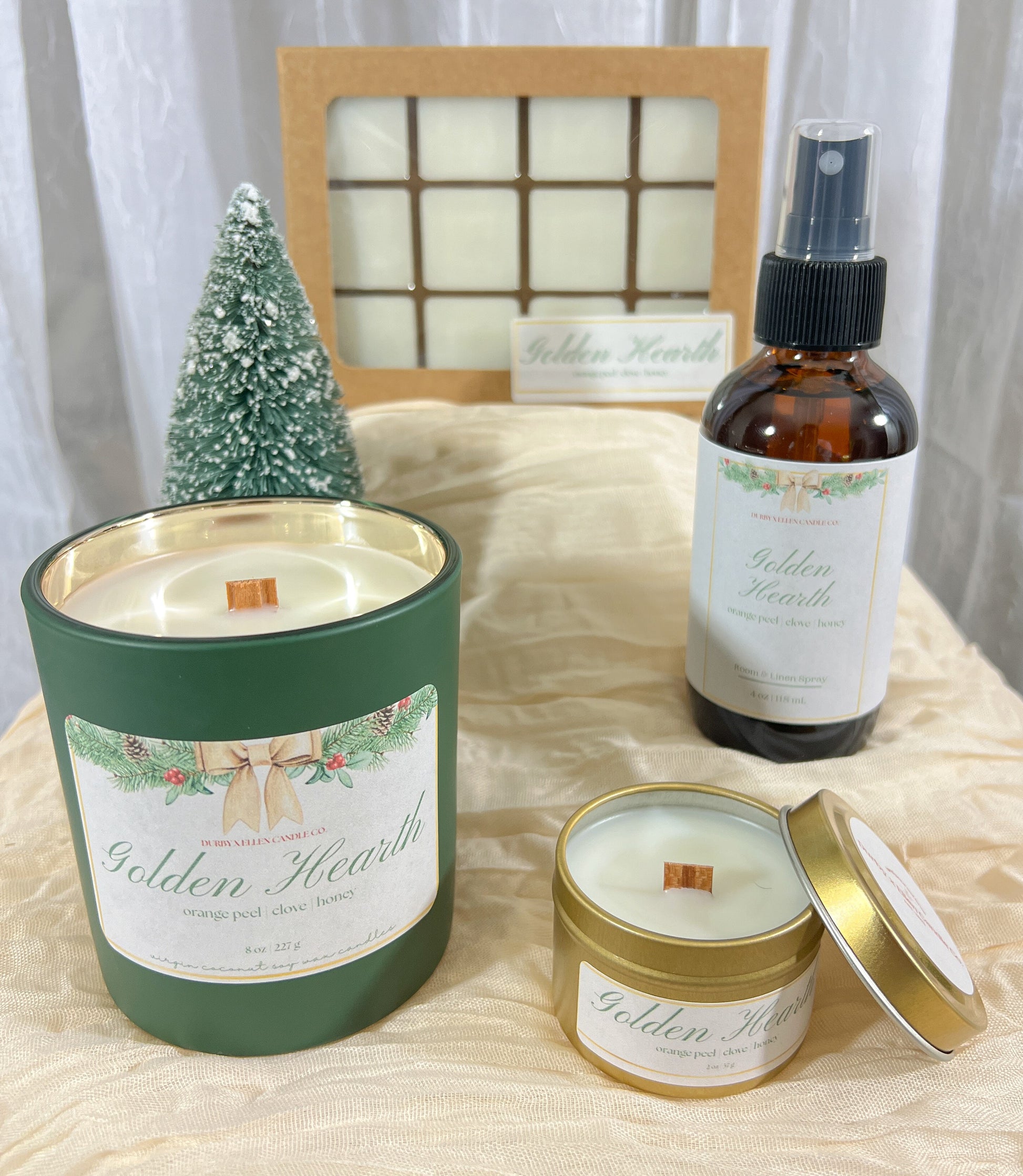 Bright and heartwarming Golden Hearth captures the scent of spiced cider simmering on the stove. Notes of orange peel and cranberry blend with warm cinnamon and honey for a cozy, uplifting aroma that glows with the feeling of togetherness.